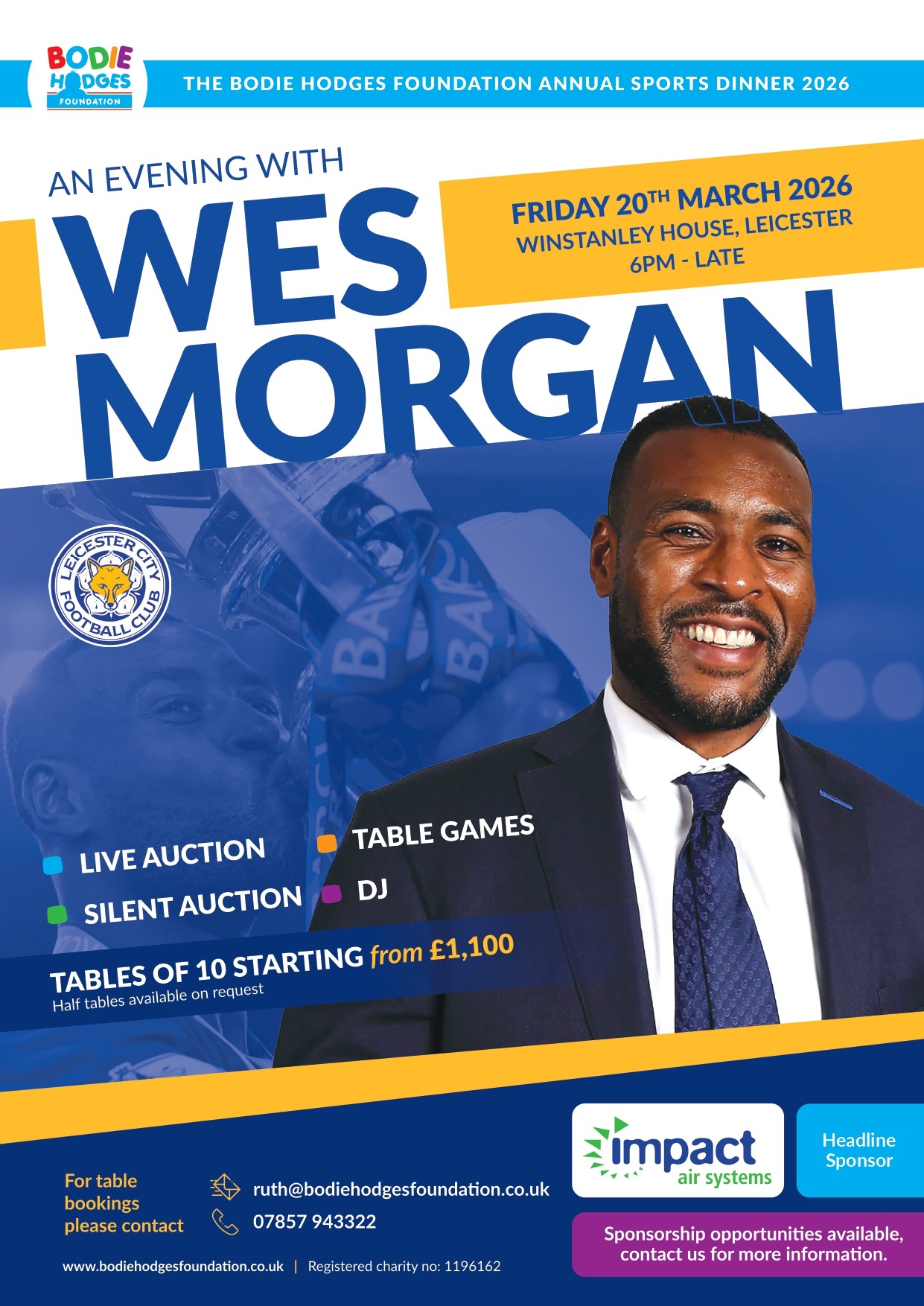 The Bodie Hodges Foundation is thrilled to share that our guest speaker for our 2026 Annual Sports Dinner is former professional footballer, Premier League and FA Cup winning captain Wes Morgan.