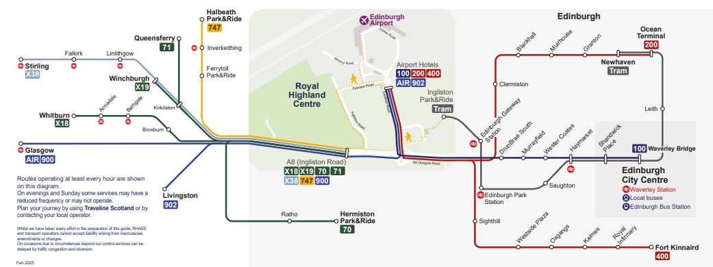 If you’re planning to take the Tram simply hop on at any stop along the route and alight at Ingliston Park & Ride. Remember to wear comfy shoes as there’s a bit of a walk to the gates! The Royal Highland Centre is also well connected to alternative bus services, check out the map below.